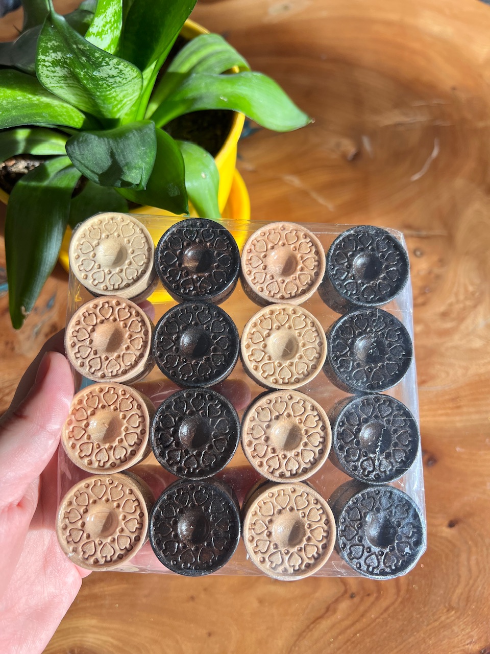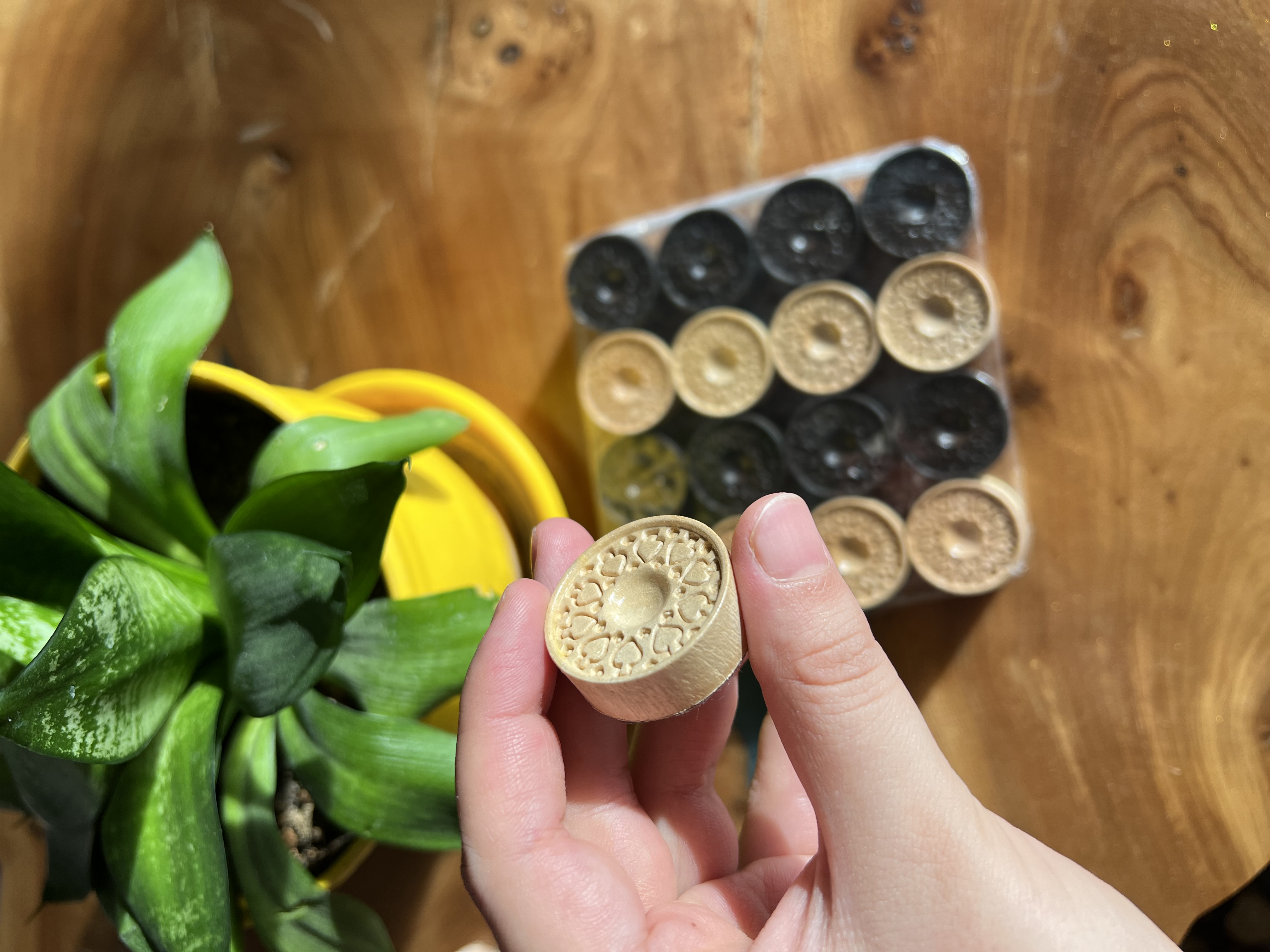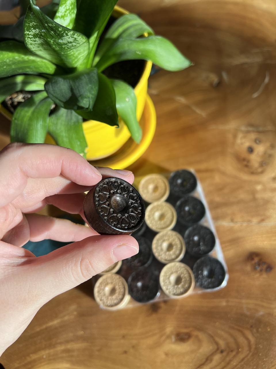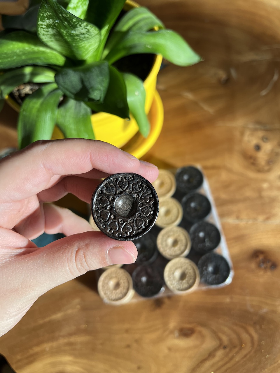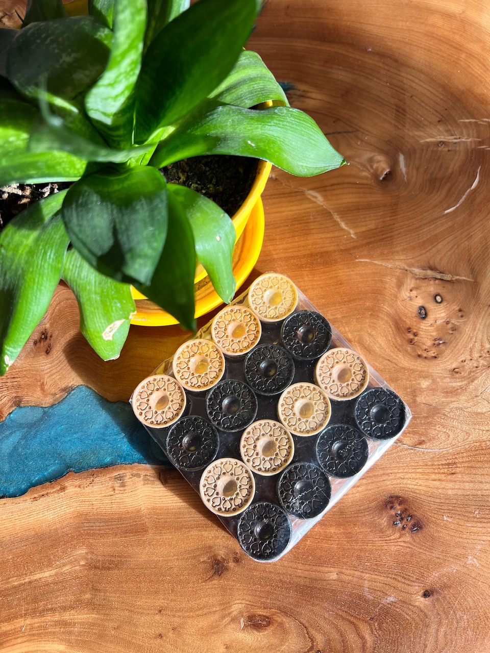 مهره تخته نرد چوب گردو منبت کاری شده طرح پیک 32 عددی کفش پارچه داره تا به تختتون آسیب نزنه قطر کف مهره ۳ سانت میباشد و مناسب تخته های سایز۵۰ ( استاندارد) میباشد