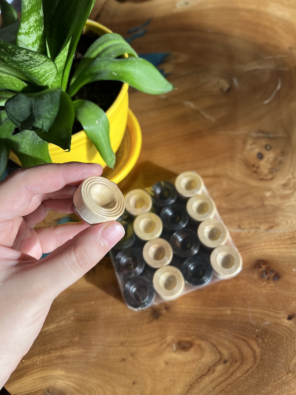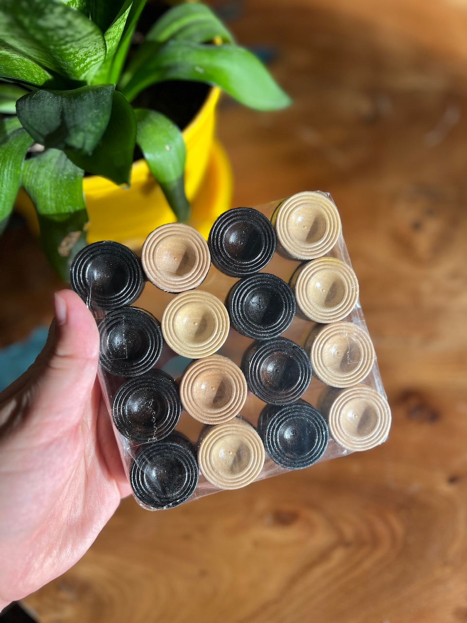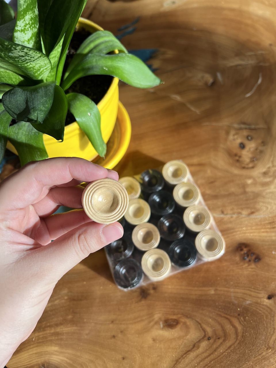 مهره تخته نرد چوب گردو 32 عددی کفش پارچه داره تا به تختتون آسیب نزنه قطر کف مهره ۲.۵ سانت میباشد و مناسب تخته های سایز ۴۰ میباشد