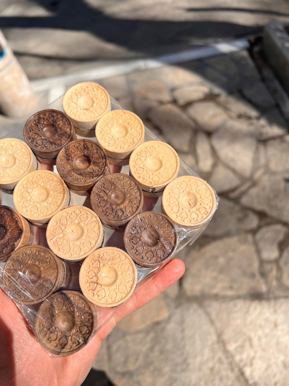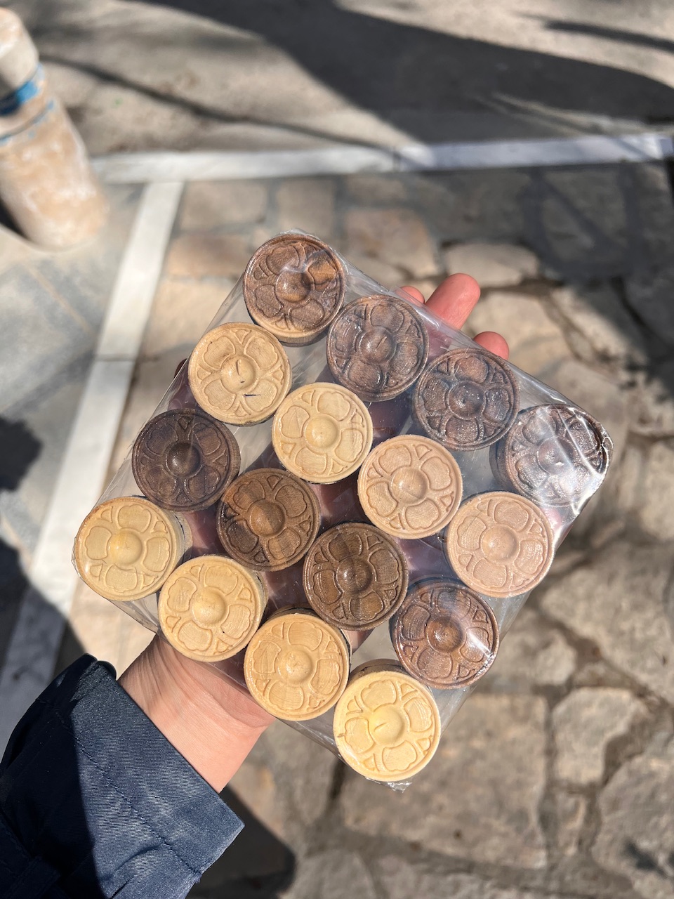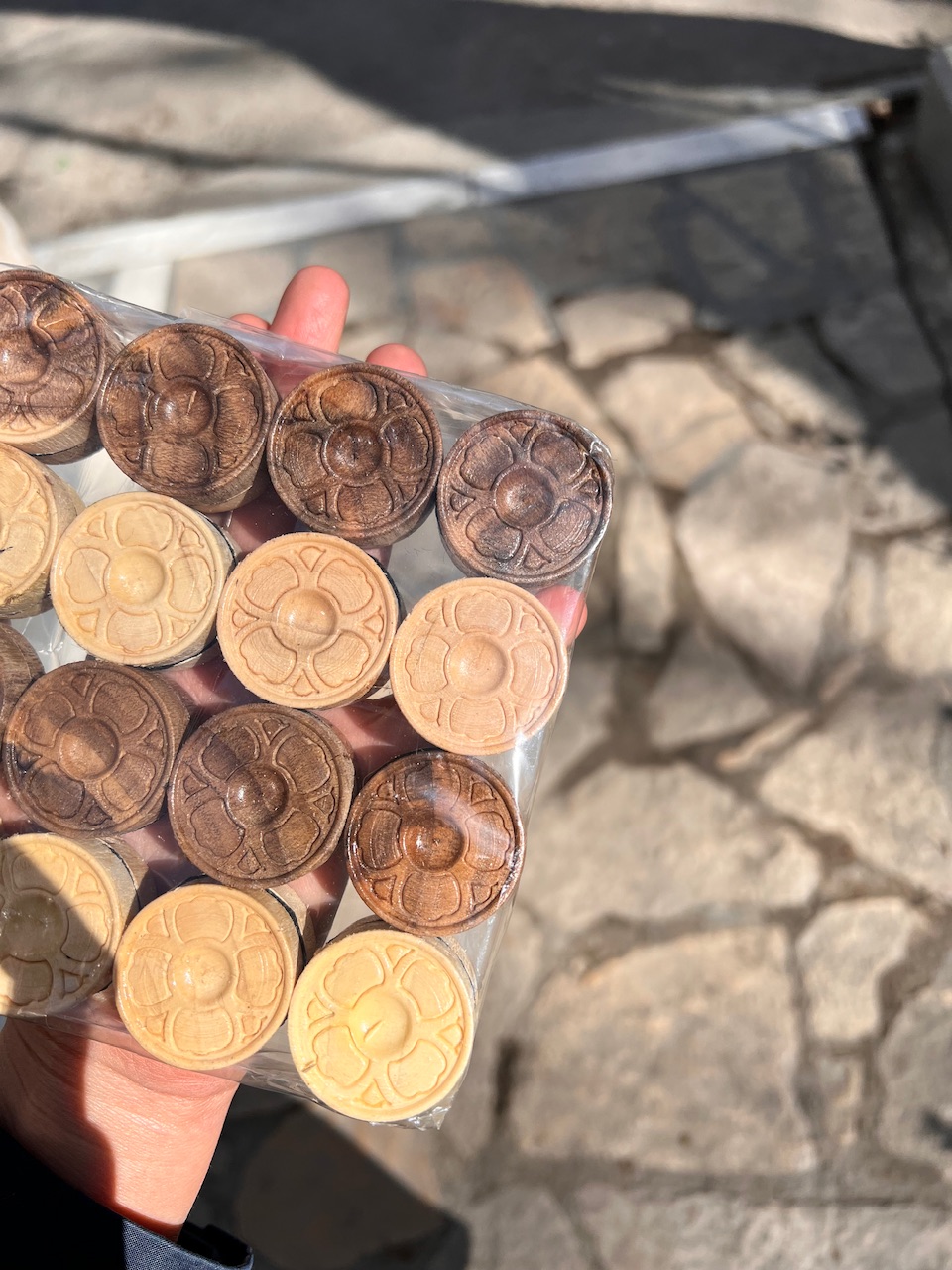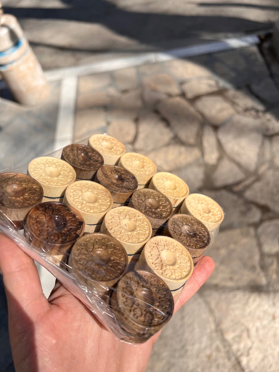 مهره تخته نرد چوب گردو مهره ها خود رنگ هستن و رنگ امیزی نشده اند منبت کاری شده طرح پیک و گل 32 عددی کفش پارچه داره تا به تختتون آسیب نزنه قطر کف مهره ۳.۳ سانت میباشد و مناسب تخته های سایز۶۰ میباشد